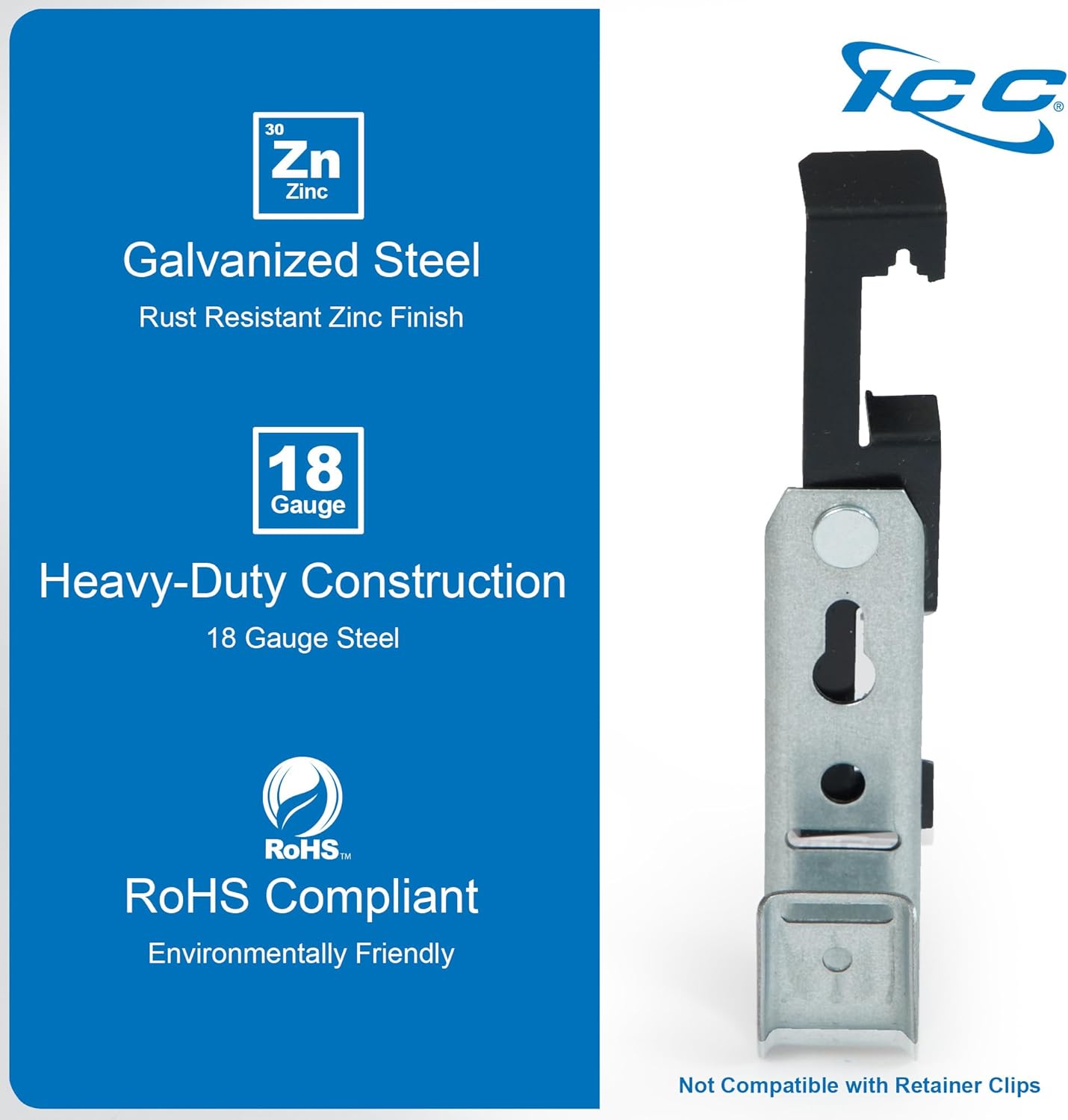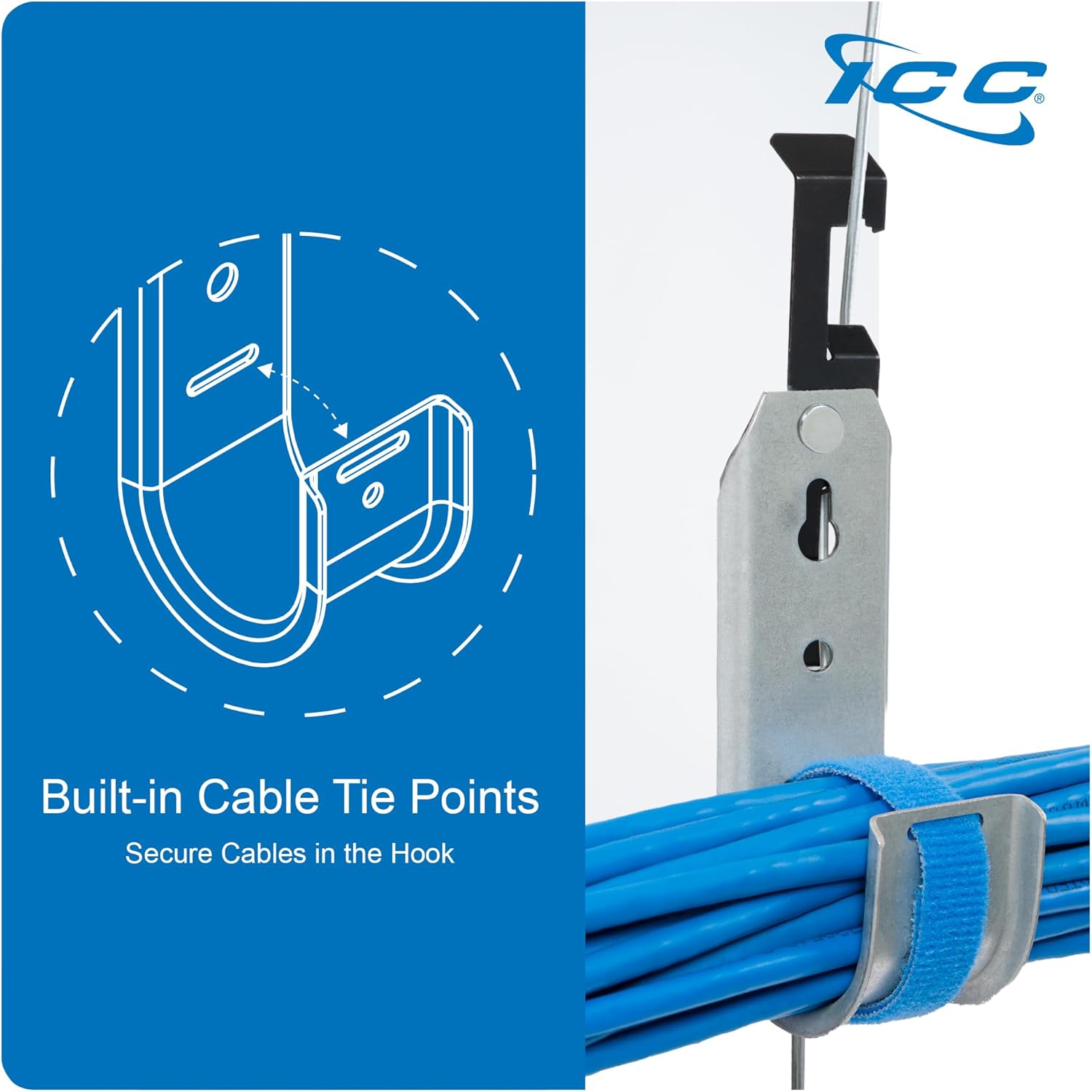 - DURABLE GALVANIZED STEEL + RUST-RESISTANT ZINC FINISH - ICC cable hooks are crafted from high-quality galvanized steel, ensuring strength, durability for all your cabling needs. Each of the large J-Hooks for cables is also equipped with a protective, rust-resistant zinc finish to extend the life and maintain the integrity of your cable installations.