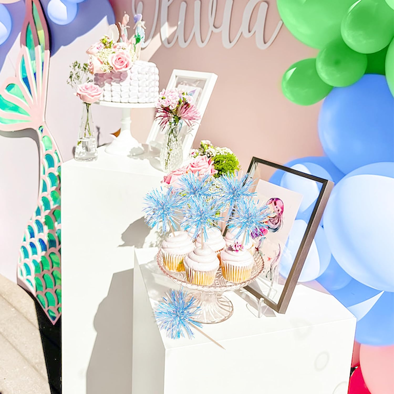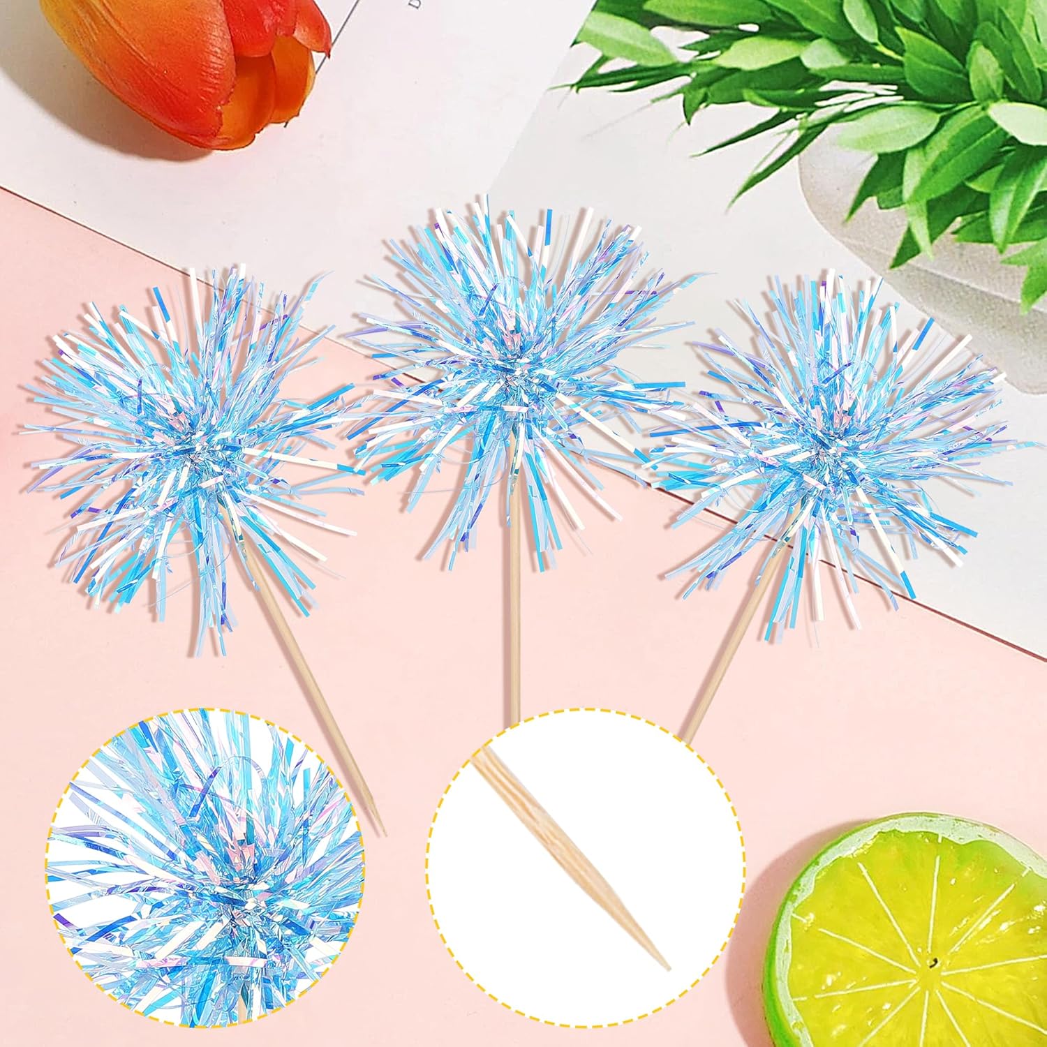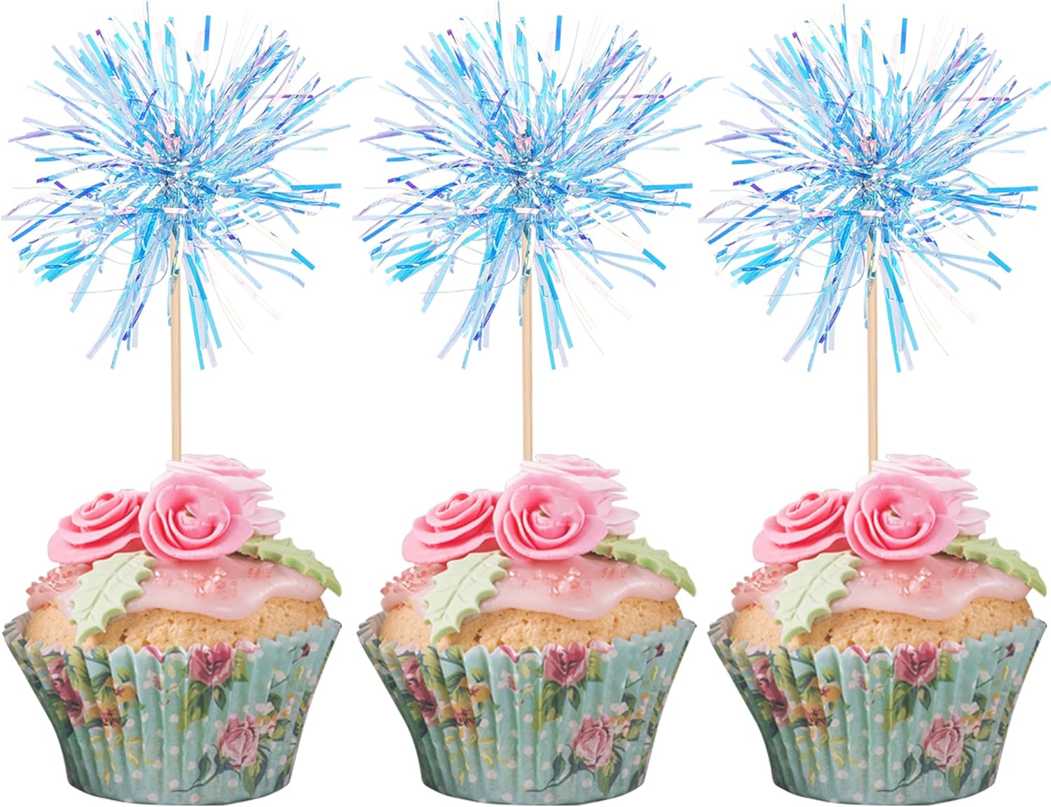 30 PCS Foil Firework Cupcake Toppers Happy Birthday Cupcake Toppers Sparkle Tinsel Flower Drink Stirrers Cocktail Fruit Toothpicks for Valentine's Day Baby Shower Party Cake Decor Supplies Blue