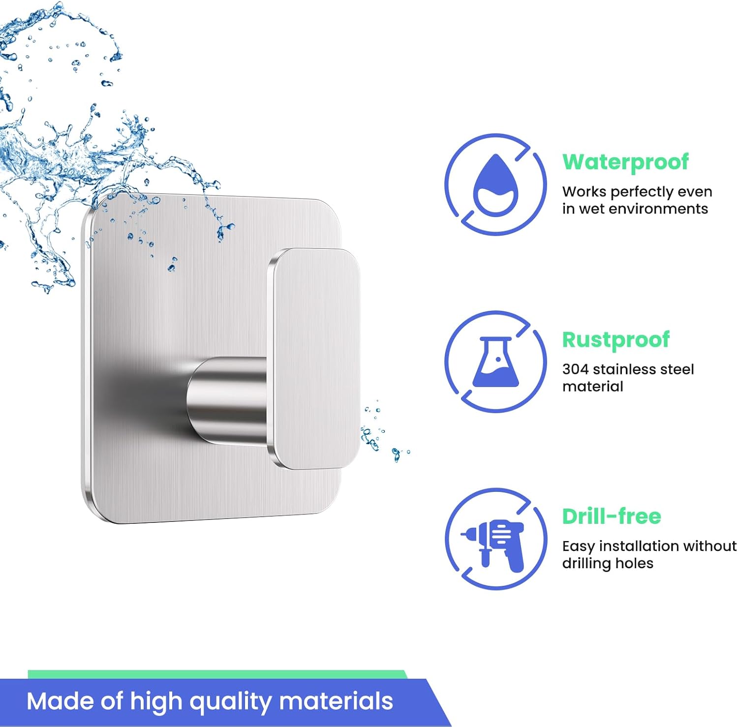- 【304 Stainless Steel - Waterproof and Rustproof More Durable】 Sticky hooks are made of high quality 304 stainless steel, the surface of the frosted process is scratch-resistant and wear-resistant, waterproof and moisture-proof and rustproof, the bathroom, shower, kitchen, balcony and other humid environments can be used for a long time, goodbye to the ordinary hooks are easy to oxidize the trouble of breakage.