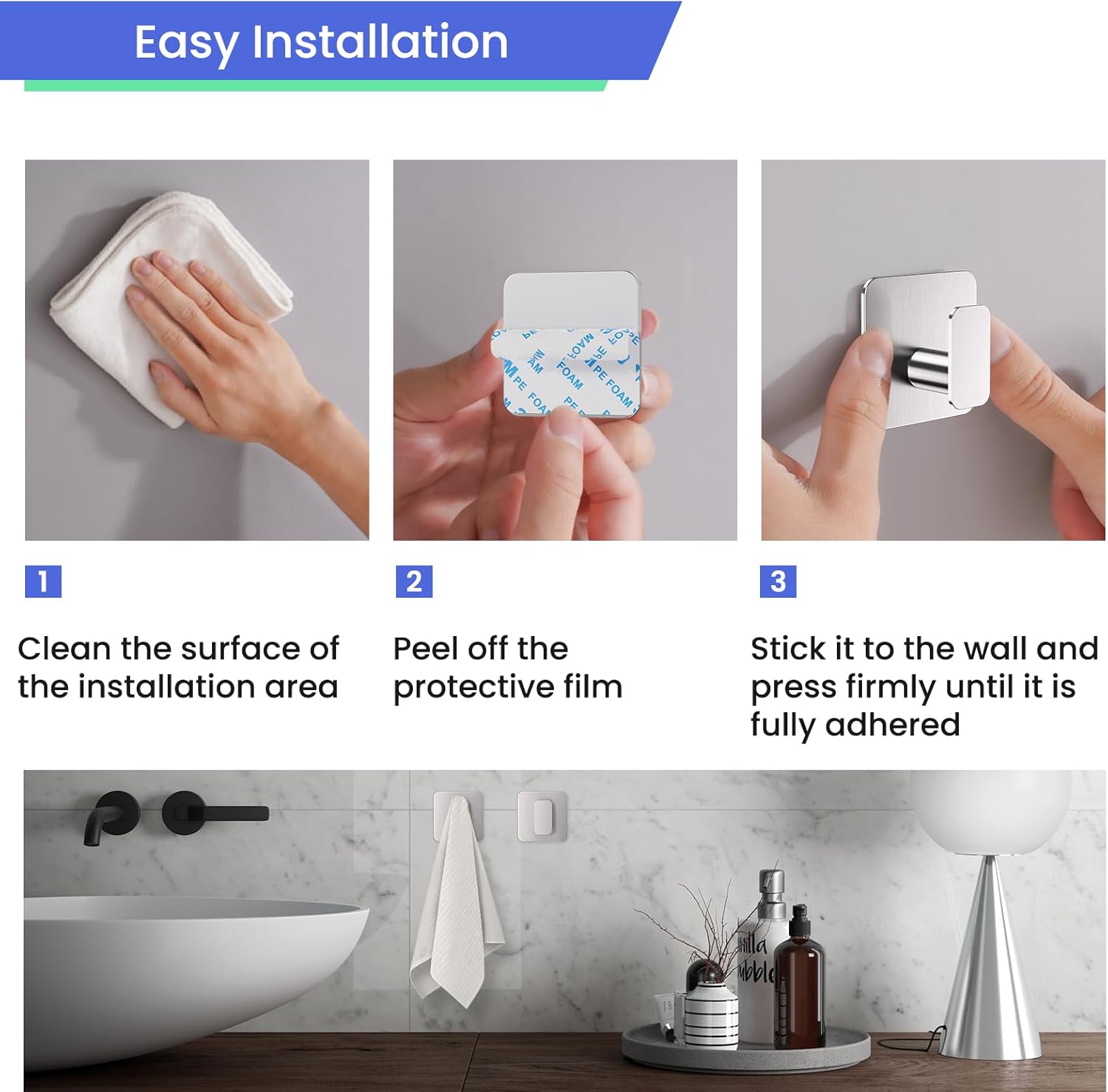 - 【Hole Free - Easy Installation】 No need to drill holes to damage the wall, tear off the adhesive backing protective film, press for 30 seconds to complete the installation, stick it as you go (wait 24 hours to hang items will make the adhesion stronger). Especially suitable for rented rooms, dormitories or do not want to damage the wall of the family, save time and effort more worry.