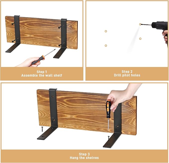 - đăSturdy Floating ShelvesăOur solid wood floating shelves can hold up to 25 lbs, featuring carbonized waterproof wood for durability. Each shelf comes with two metal brackets and 8 screws, ensuring stability and strength. These shelves provide a practical and stylish solution for displaying your favorite decor items.
