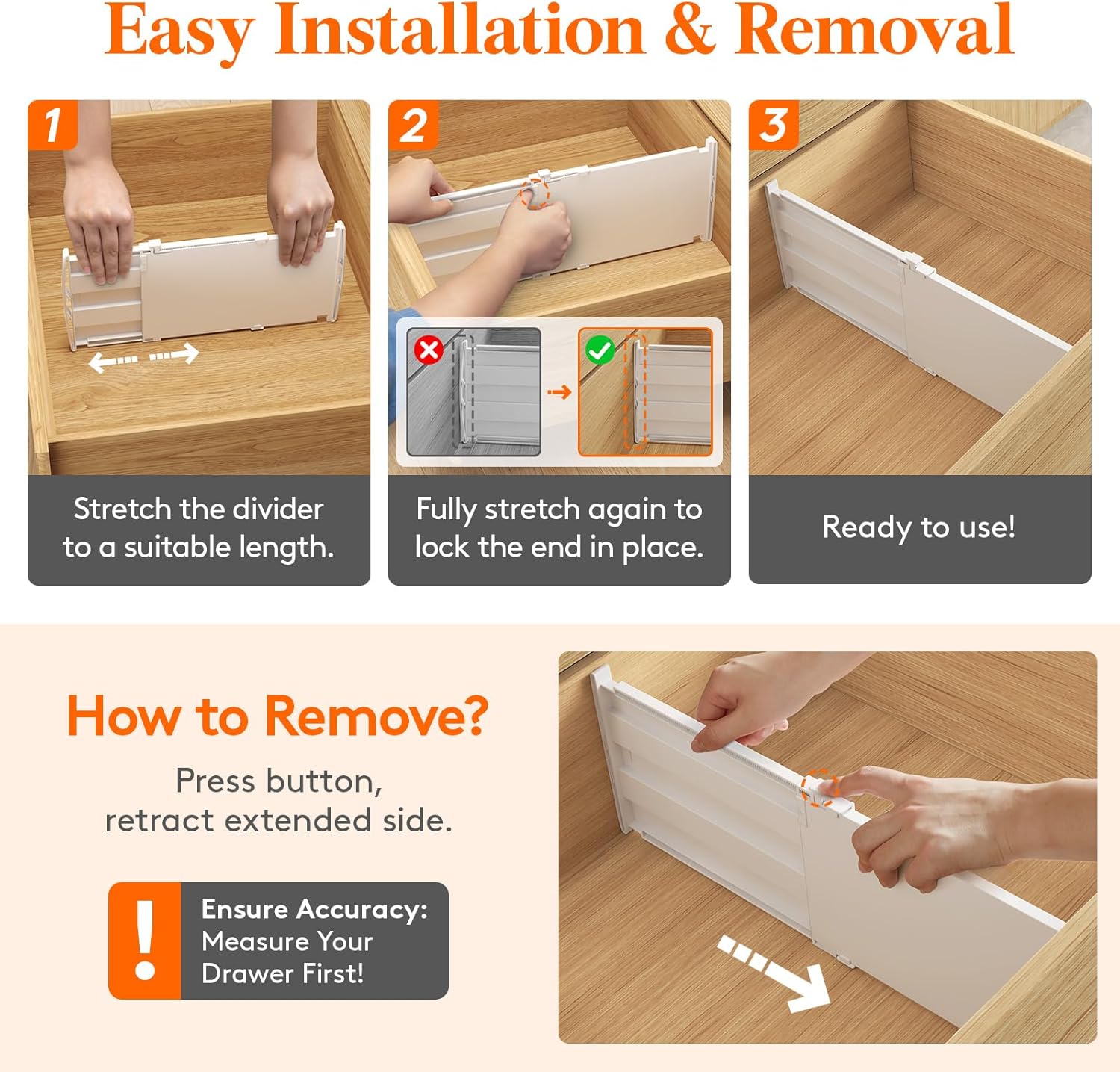 - Excellent Stability: These drawer organizers resist cracking, warping, or breaking. Their two-way self-adjusting design and silicone non-slip pads on both sides ensure they stay firmly in place with excellent stability